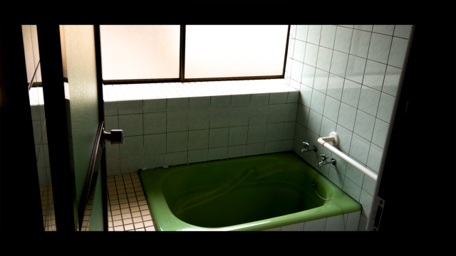 浴室は、古い日本家屋ならではのタイル張りの空間です。その空間の中に鮮やかなグリーンの浴槽が、