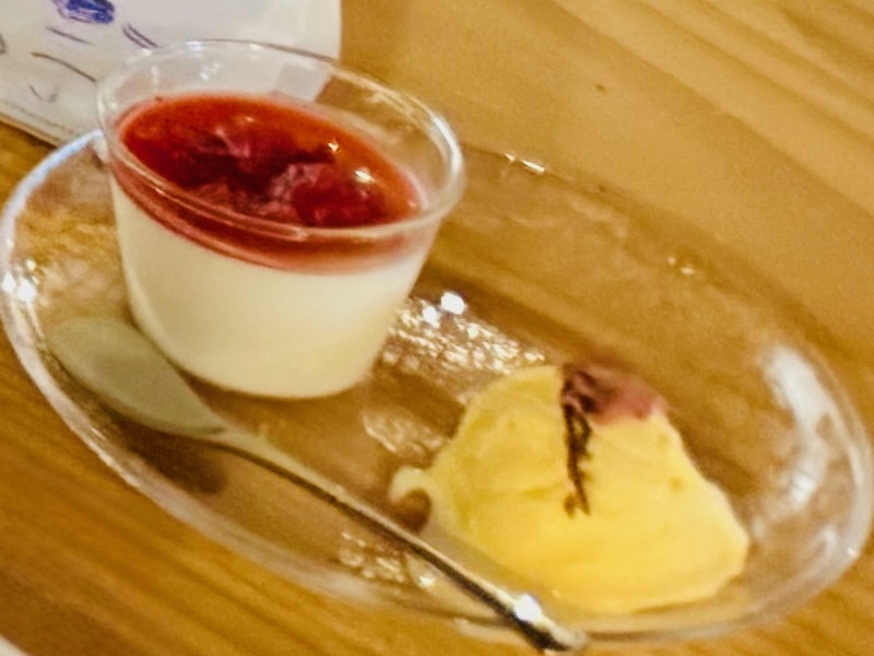 用意していただきました。パンナコッタには今回のテーマ「桜」に合わせて桜の塩漬けがアイスクリームと共に添えられており、