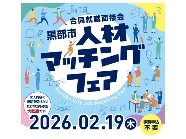 黒部市内企業と求職者が直接つながる「黒部市人材マッチングフェア」を開催します。 黒部市で働く魅力を知り、あなたに合った仕事と出会えるチャンス…