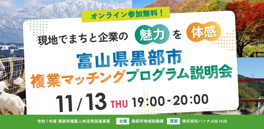 そんな想いを持つ皆さまに向けた、黒部市の複業マッチングプログラム参加者を募集します。
