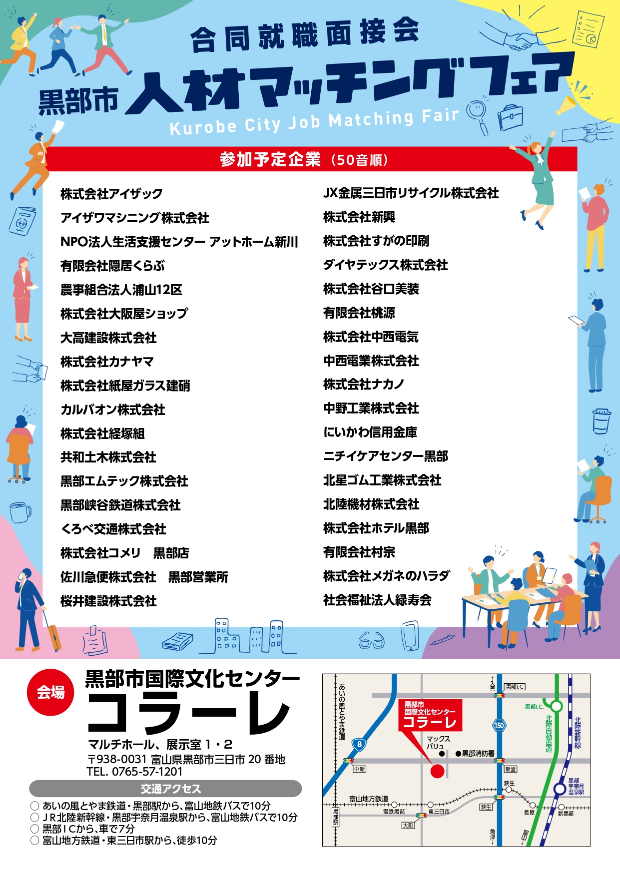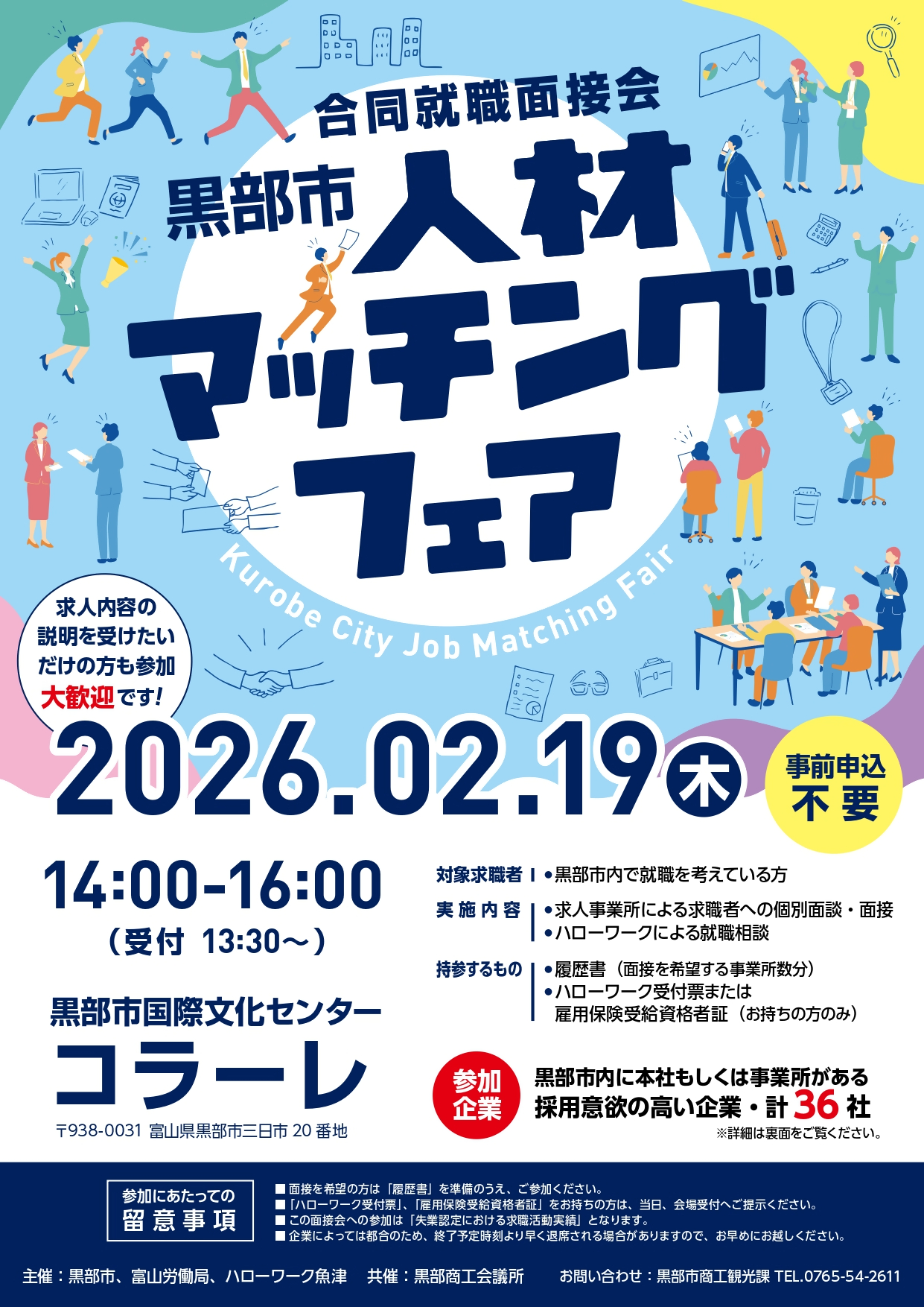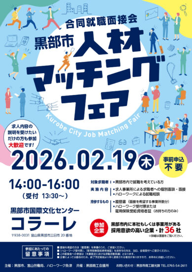 黒部市人材マッチングフェア (合同就職面接会・企業説明会)を開催します 2026/01/21 黒部市内企業と求職者が直接つながる「黒部市人材マッチングフェア」を開催します。 黒部市で働く魅力を知り、あなたに合った仕事と出会えるチャンスです! 詳細はこちら